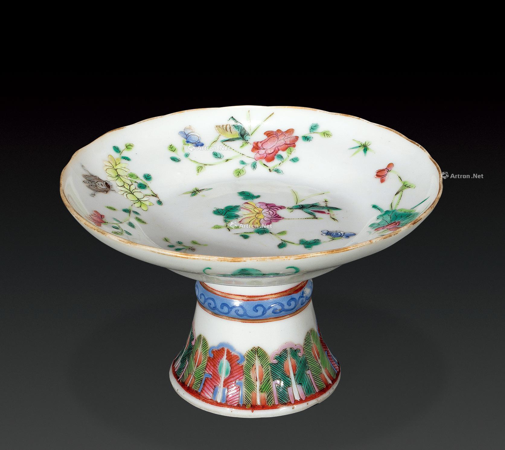 您眼前的这件粉彩高足瓷盘采用的是严整工细、刻画微妙的工笔画风,盘中的梅、菊、牡丹、荷花仿佛自带柔焦滤镜,精微处,丝毫不爽;足胫的水波纹、礁石纹恰似特效暗流涌动,豪放处,生动活泼;圈足的缠枝花卉和腹部的五只蝙蝠,相映成趣,寓意“五福”,更是将瓷、画、意完美结合。整个瓷盘画面秀丽雅致,精巧细腻。立体质感,层次丰富,高贵华丽,艳而不俗,也彰显出庄重、典雅的“富贵气象”,这也使得这件粉彩高足瓷盘与众不同、堪称经典。