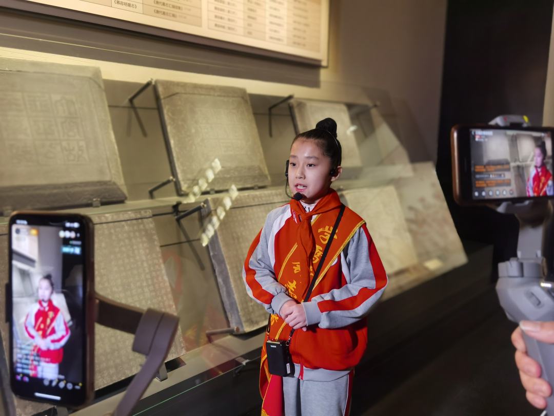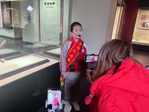 之后,8名来自武威师范学校附属小学的红领巾讲解员走进展厅,为线上的观众讲解我馆馆藏精品文物。“欢迎大家来到武威市博物馆,我是红领巾讲解员……”“国宝级文物,王杖诏书令册简于1981年出土于武威磨嘴子汉墓群……”,一张张稚嫩的脸庞讲述着一件件精彩的文物,完整的讲解、规范的动作、甜美的童声吸引了不少游客驻足聆听,她们充满情感的讲述也赢得了屏幕前家长、老师和同学们的热烈回应和赞扬。