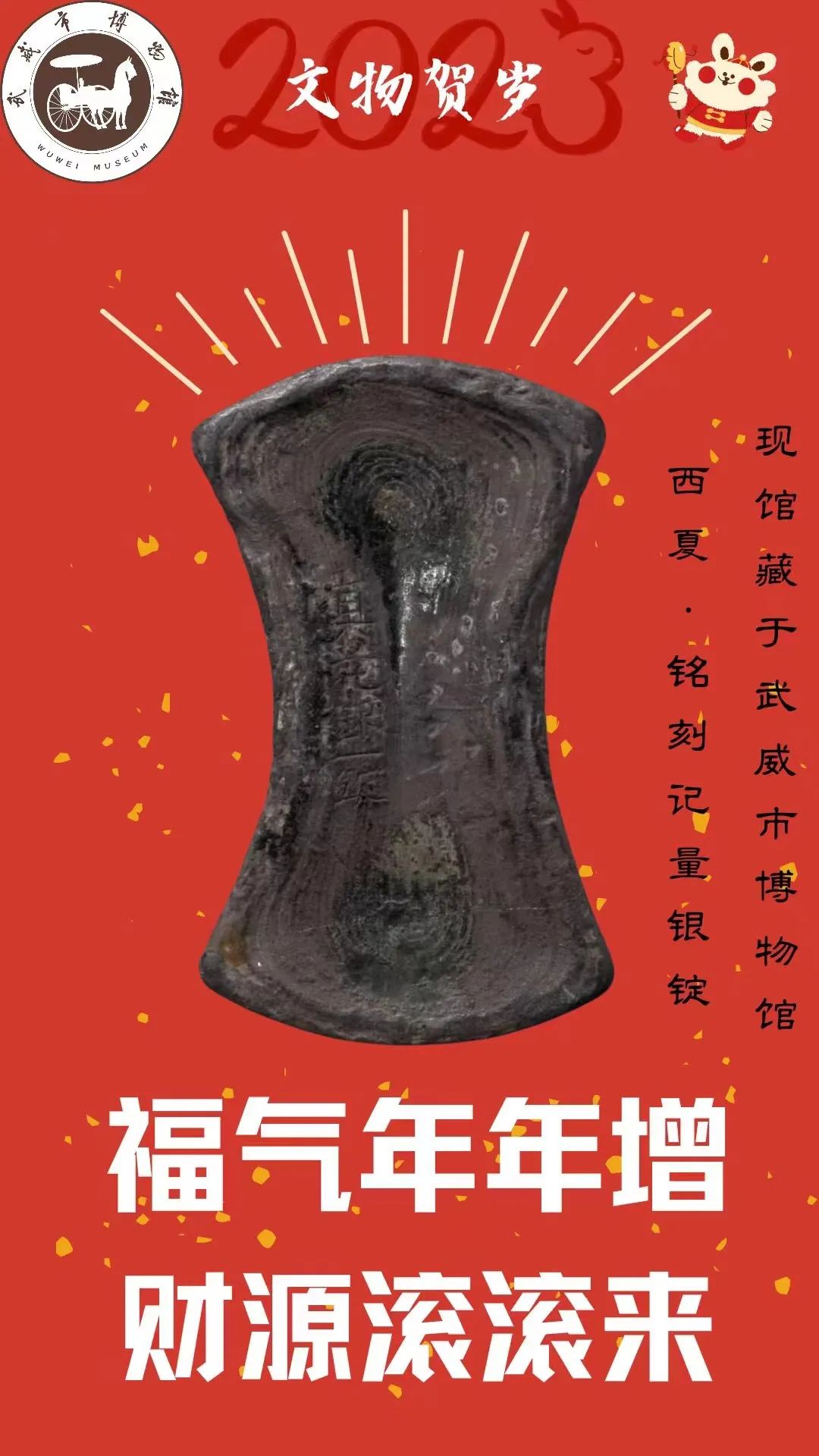 新年伊始,万象更新。武威市博物馆特推出新春兔年文物贺岁系列海报,为广大观众送上春节祝福,丰富人民精神文化生活,展现文物中蕴含的中国力量、中国精神,营造欢乐祥和的节日气氛。