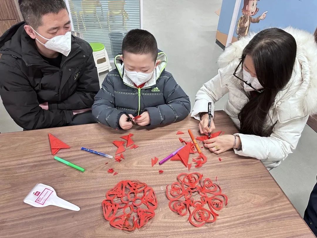活动现场,讲解员老师首先为大家讲解了中国传统艺术剪纸的起源、发展和种类,展示了众多剪纸艺术作品,介绍了剪纸的基本技巧和注意事项,随后一边进行示范,一边讲解着折纸步骤,逐一教小朋友们剪可爱的迎春小兔子。在老师的指导下,一把剪刀,几张彩纸,迂回环绕,惟妙惟肖,一张张彩纸在孩子们手中变幻多样,不一会儿功夫一幅幅寓意吉祥的剪纸小兔子就呈现在大家面前。“姐姐你看,我剪的小兔子好看吗?”、“我要把这个小兔子贴在我家窗户上。”他们迫不及待地展示着自己的作品,活动现场洋溢着欢乐祥和的春节气息。