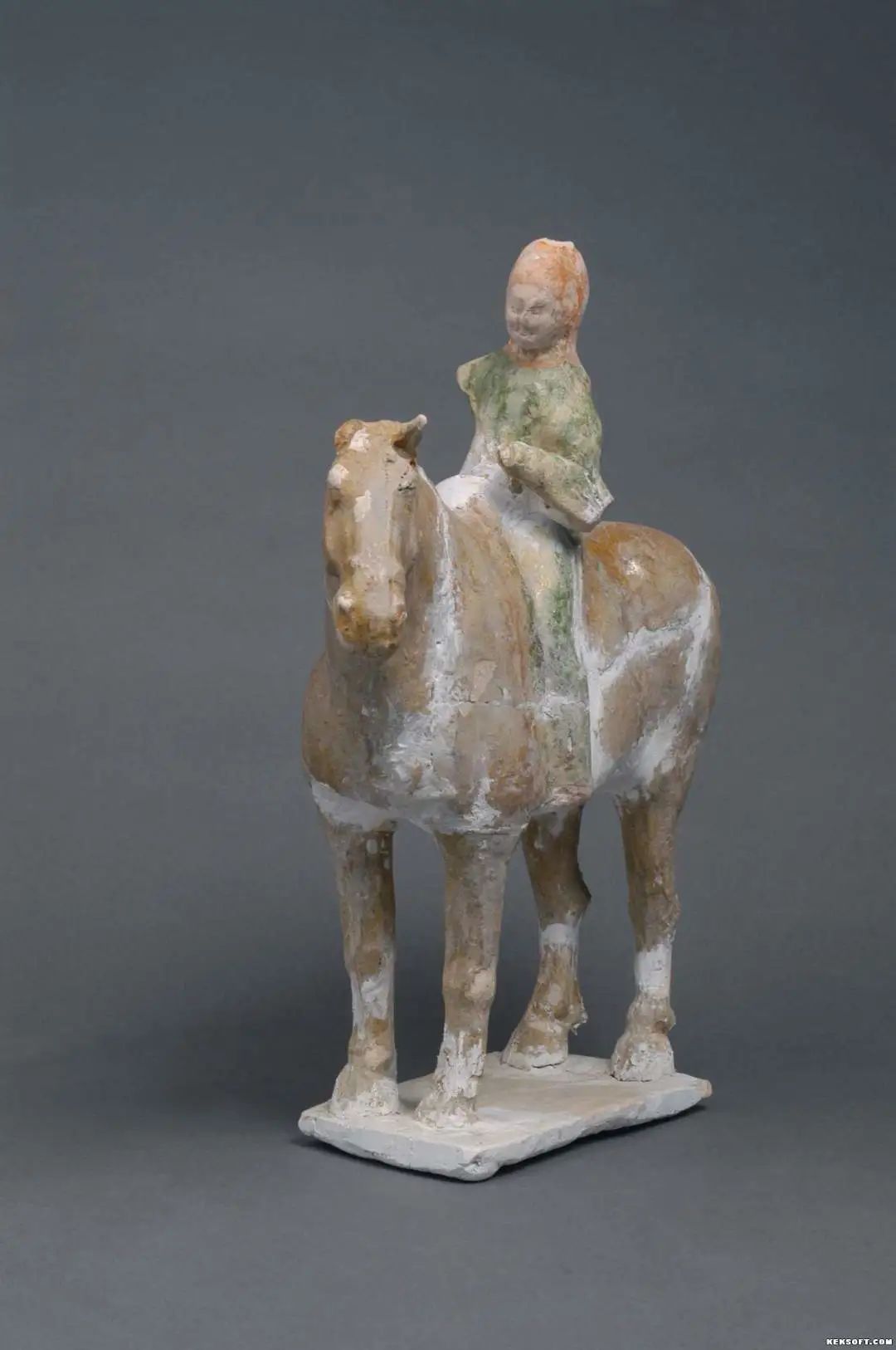 今天向大家分享的是唐三彩骑马女俑。唐代陶器 。红陶质,马立于长方形踏板上,头微偏,眉目不清,长颈宽,短鬃直立,四肢粗壮,体格健硕。马背设鞍,骑俑坐于鞍上,头戴风帽,面部丰满,左臂弯曲置于胸前,无手。马施桔黄色釉,俑身、风帽施绿釉。为国家三级文物。现藏于武威市博物馆。