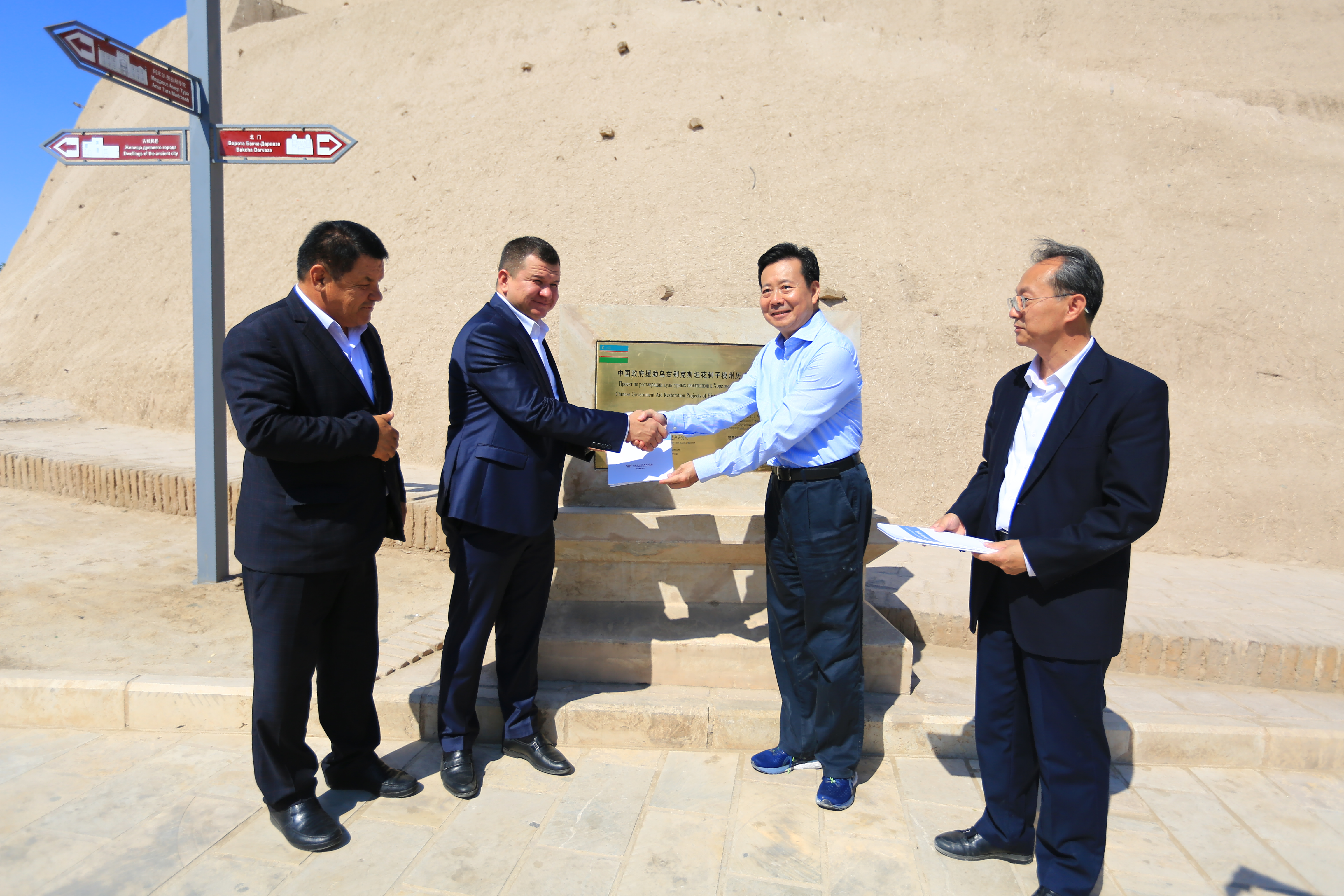 中国文化和旅游部副部长、国家文物局局长李群在中国政府援助乌兹别克斯坦文物保护项目纪念碑前,将维保手册交付给乌方,圆满完成援乌项目移交工作。