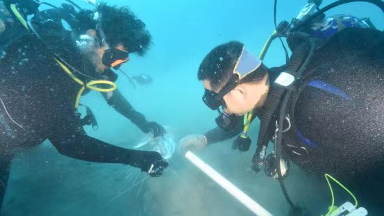 中国考古工作者在沙特阿拉伯塞林港遗址海湾水下考古现场取样