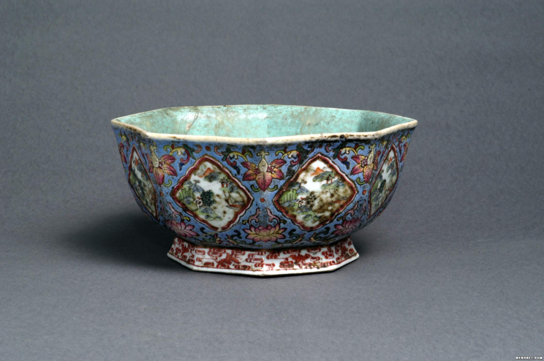大家好,今天为大家分享的是清“道光款”八角形五彩瓷碗。平面呈八角形,深腹,圈足外撇。白胎,碗内壁足底施绿釉。外壁施蓝釉,八个平面上各开一圆窗,窗内绘五彩山水图,八棱上绘石榴和莲花。外壁施白釉,上绘红色蝙蝠图案。底朱文篆书“大清道光年制”三行六字。为国家三级文物,现馆藏于武威市博物馆。