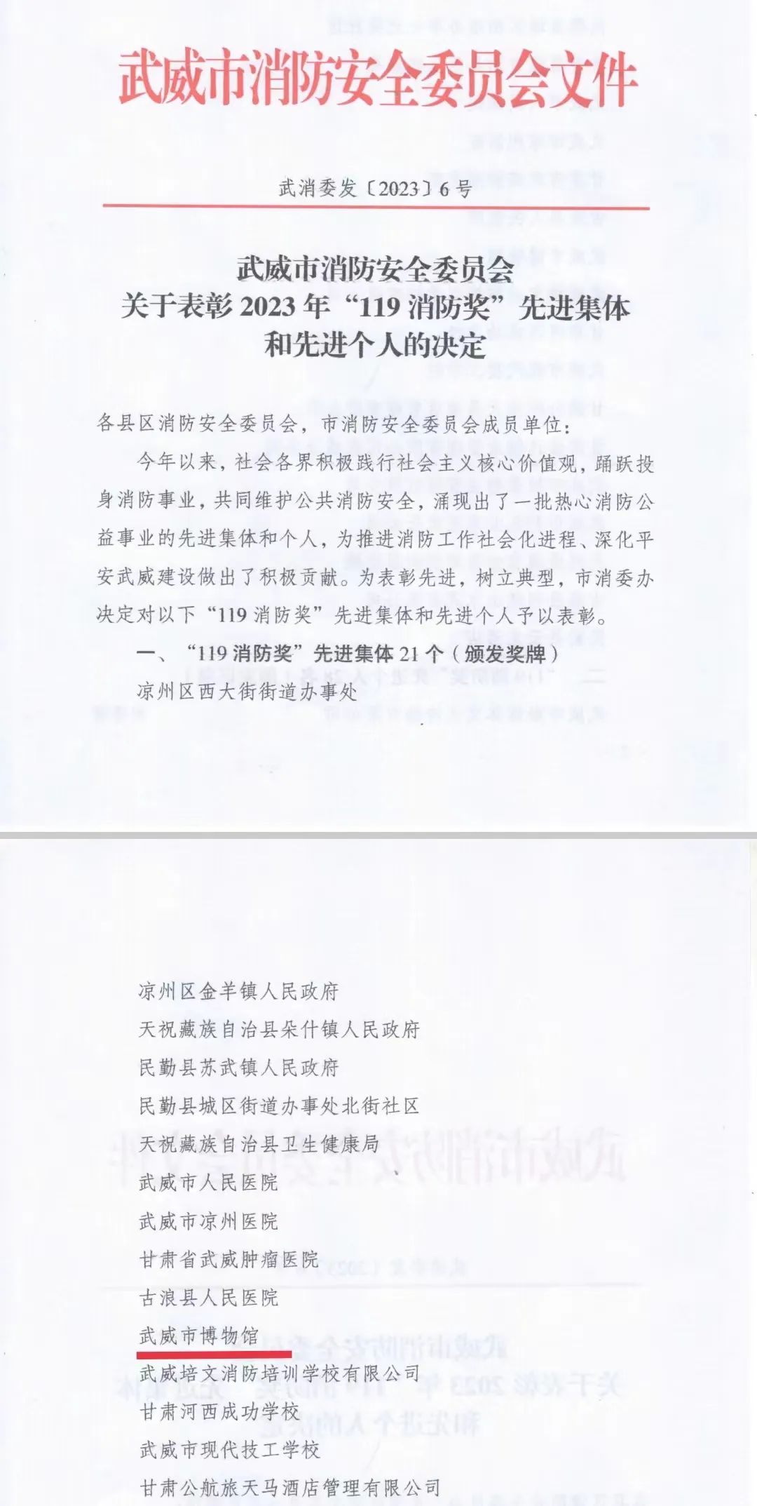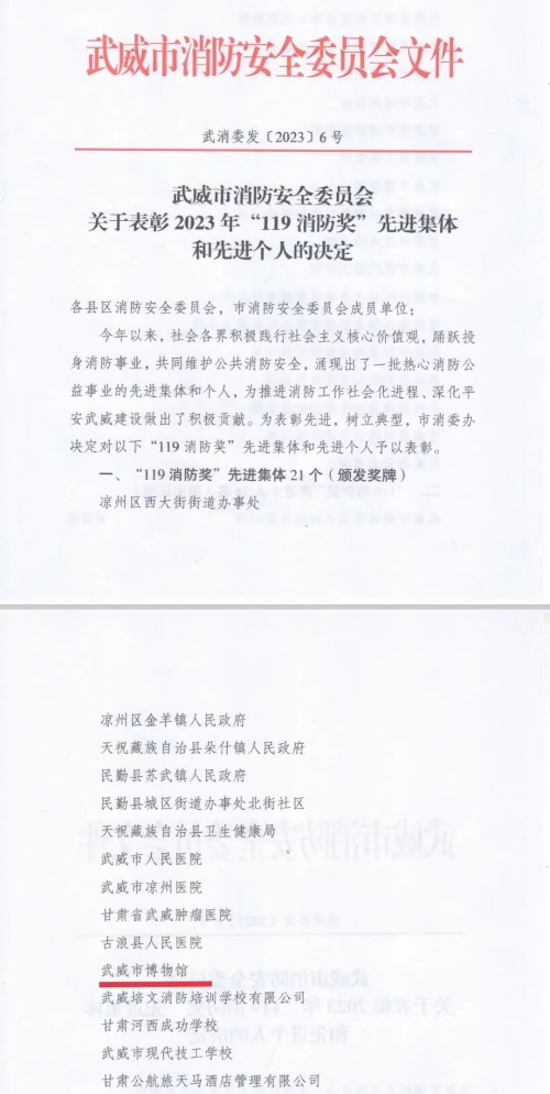 11月8日,在习近平总书记授旗致训词五周年主题宣传暨2023年武威市消防宣传月活动启动仪式上,武威市博物馆荣获2023年度全市“119消防奖”先进集体荣誉称号。