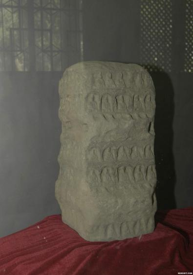 大家好,今天为大家介绍的是一件魏晋时期雕塑造像石造像塔。四棱柱体,顶面正中有一方形凹坑;四侧面均雕五层小佛像,每层三至七人不等,均高肉髻,披通肩袈裟,跏趺坐,禅定印。正面正中大龛内雕结跏趺坐佛一尊,施禅定印。佛两侧立二弟子,其中两侧有不规则的圆孔数处。雕刻较粗糙。高58厘米,宽27厘米,长26厘米,为国家三级文物。