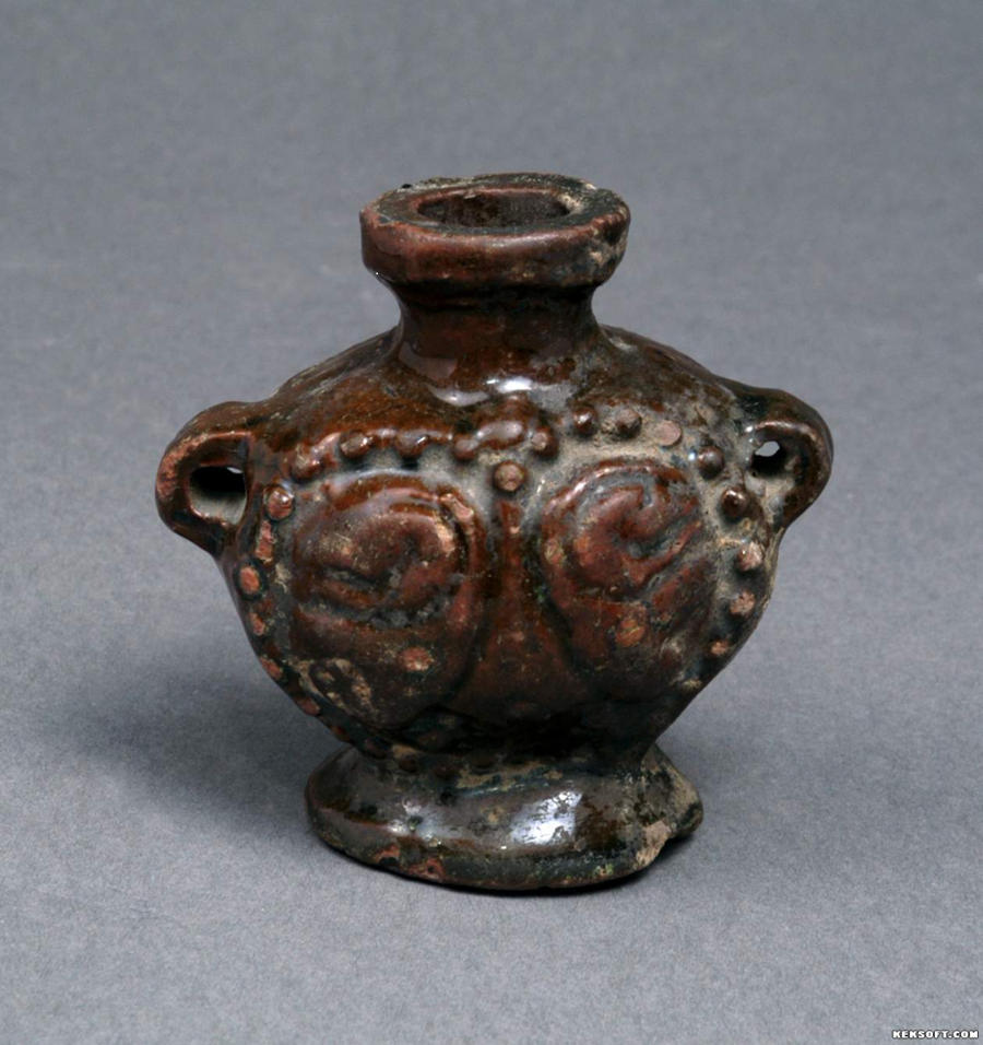 大家好,今天为大家分享酱釉瓷扁壶。西夏,瓷器。椭圆口,平沿厚唇,束颈,平肩,腹部呈心形,台形底座。肩有桥形双耳,壶腹部正反两面有纹饰,心形一周饰连珠纹。通体施酱色釉。为国家三级文物。现藏武威市博物馆。