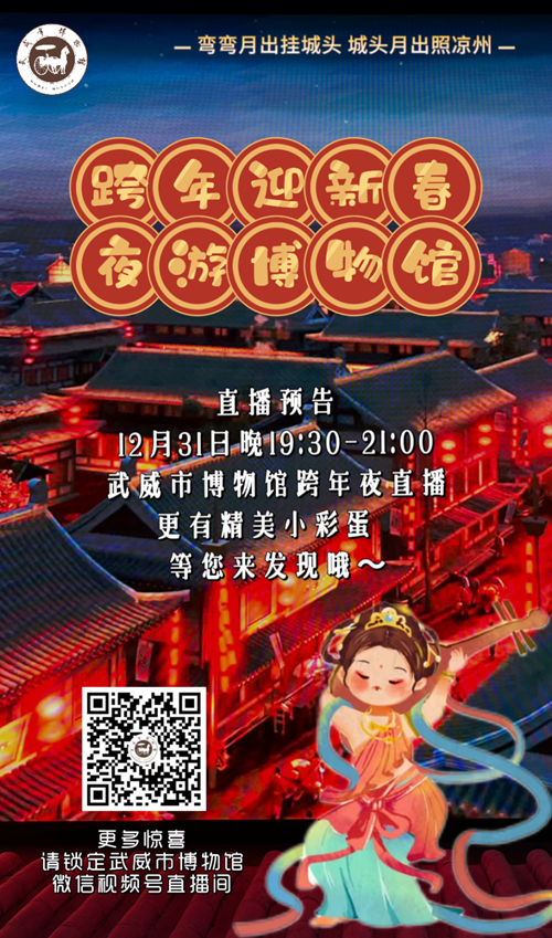 不容错过的精彩亮点 1.线下义务讲解: 时间:12月31日晚20:00 地点:市博物馆大厅 为大家呈现一场历史与文化的饕餮盛宴,通过解说员的生动介绍,让历史在你眼前活灵活现。 2.线上直播惊喜不断: 时间:12月31日晚19:30 地点:武威市博物馆官方微信视频号 跨年夜的热度不止于线下!届时将在武威市博物馆微信视频号平台进行直播互动,更有惊艳的文化舞蹈表演,将传统与现代完美结合,每一个舞步都是对历史的致敬。 3.新年祝福好运连连: 时间:12月31日晚18:00——21:00 地点:市博物馆服务台 设立新年寄语本,每一位观众都有机会在特制祝福本上写下美好的祝福,送给自己、送给家人、送给朋友。在这个充满仪式感的瞬间,大家共同感受到跨年的温馨和祝福。 跨年夜“夜游”活动, 欣赏夜幕下的武博, 在灯光的映衬下, 漫步于展厅, 感受博物馆在夜晚的神秘与宁静, 体验别样的文化氛围, 让历史与文化以更富有想象力的方式展现。 让我们共同点燃热情, 用欢笑和祝福迎接崭新的一年! 12月31日晚 我们不见不散!