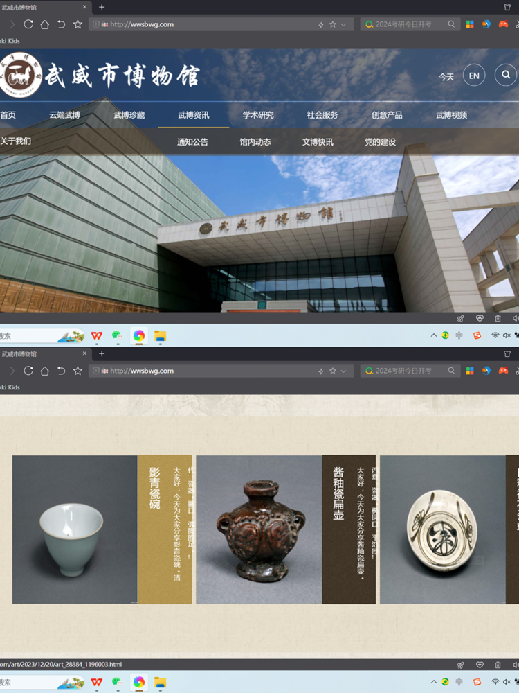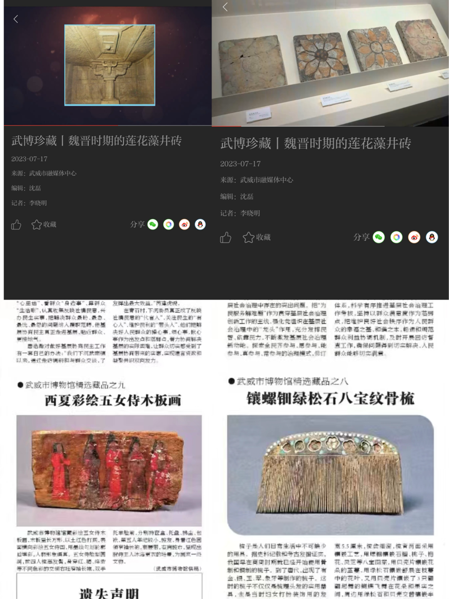 为了进一步提升武威市博物馆的宣传效果和观众体验,2023年我馆对官方网站进行全面更新,更好地满足观众线上需求。对主界面设计优化,增加展示内容模块,配合多媒体展示,进行移动端适配等。改版后的官网风格更加赏心悦目,便捷的版式为用户带来全新的浏览感受,是对观众提供线上服务的进一步优化,也为武博宣传工作的专业性和便捷化奠定了基础。