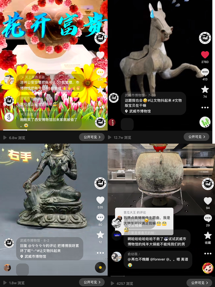 线上生活是现代社会中不可或缺的一部分,我馆在多个平台开设的账号和专栏,已经成为服务观众、宣传文化的主场。全年在微信公众号、视频号、抖音、快手等平台保持日更频率,发布《线上云游博物馆》《武博珍藏》《武博文创》《把武博讲给你听》《博物馆陪您过大年》等系列信息797条、视频432条,文物录音365条,浏览量累计500万次,文博新媒体矩阵全线开花。坚持正确舆论导向,牢牢把握意识形态工作正确方向,营造积极向上的宣传舆论氛围。同时,紧跟社会潮流,用观众喜闻乐见的方式让宣传更亲民、更接地气、更有趣味,积极创作各类科普展示短视频,单个视频点赞量近13万次,观众互动500余条,粉丝粘性大大增加,武博“朋友圈”日益活跃。