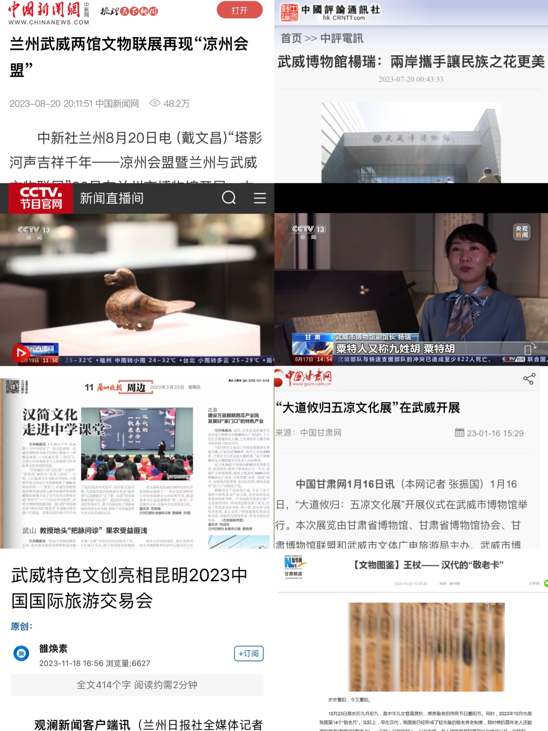 建立对外宣传工作机制,实现各媒体信息资源共享,持续扩大对外传播力和影响力。新华网、中国新闻网、中国甘肃网、兰州晚报等多家主流媒体报道我馆陈列展览、社教活动、文创产品等方面的特色亮点;我馆与武威市融媒体中心联合策划推出的“武博珍藏”系列栏目15期在市电视台新闻频道播出,反响热烈;在武威日报推出专栏12期展示馆藏精品文物;两次在央视新闻频道华丽登场,在一次次广泛有力的宣传报道中,武博声音、武威故事走向全国、走向世界,影响力和美誉度空前提升。