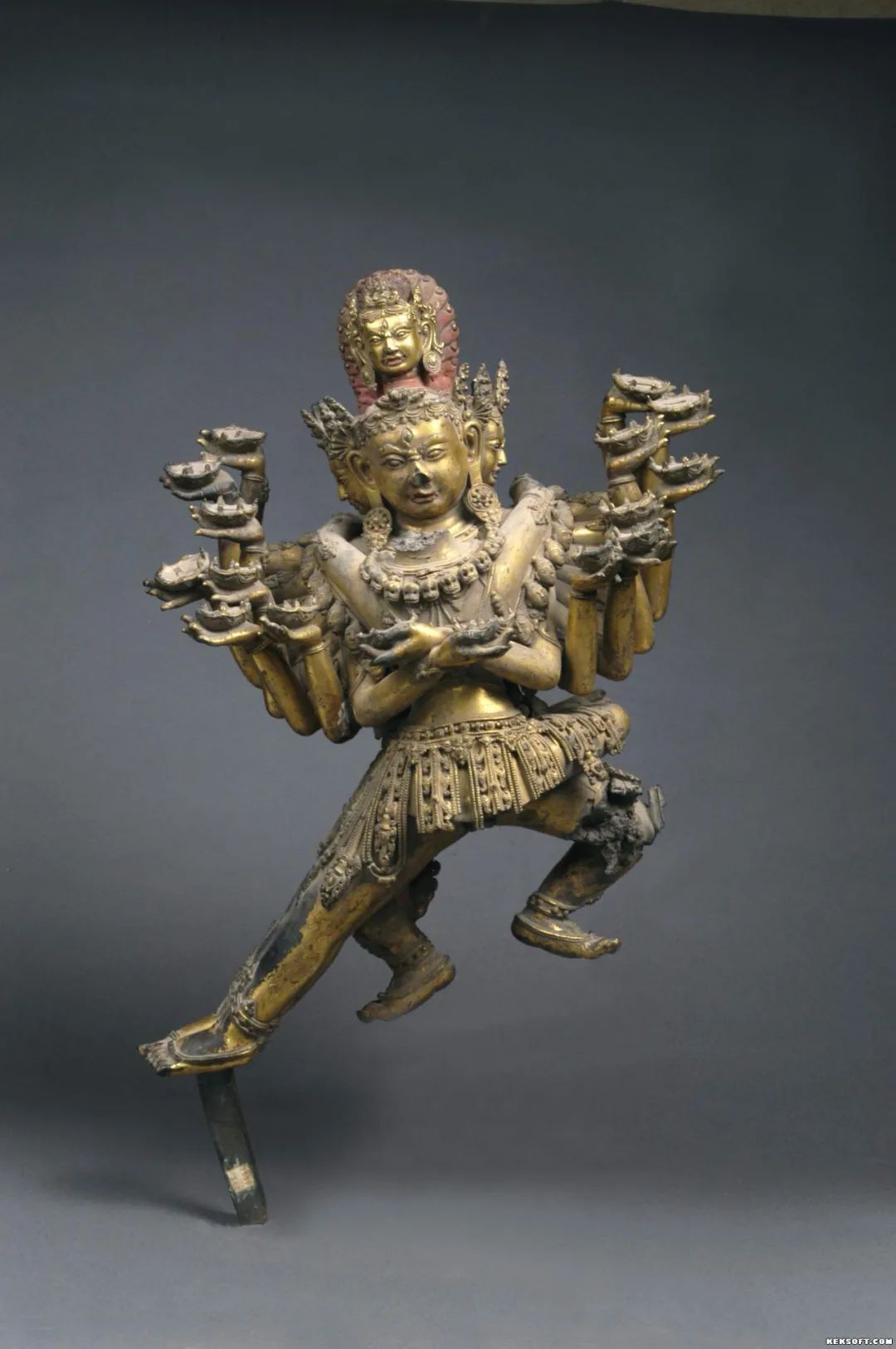塑像正面的鼻子和上唇都已破损,嘴唇与头饰均为红色,最上端头顶后的火红色头饰构成一个屏状。另外,造像通体鎏金,右腿外部的鎏金有磨损。主尊勇武威猛,呈舞立姿态,前右腿右展,置于无我母左腿之后。与无我母的左脚在尺寸上有细微差别,后面双腿呈舞蹈状,曲膝,足跟上抬,前左腿膝盖以上部位已破损。与现存具有相同主题且第六印为人骨链、保存完好的喜金刚双身像相比,可看出其前面左腿应曲膝,前腿垂直,左脚跟与脚尖稳固站立成为唯一的支撑。从断裂处可以看到造像并非中空,且造像重量极重,为实心青铜浇铸。