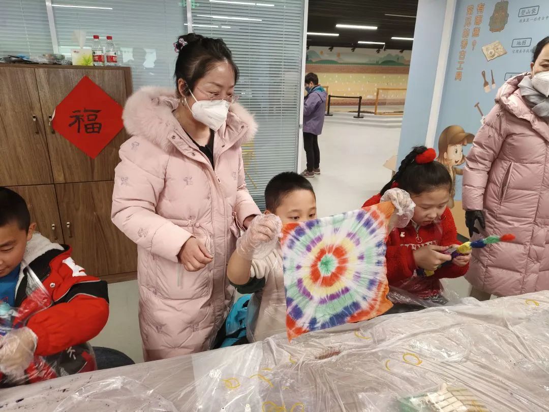 “凉州绯色,天下之最”。绯色是一种非常鲜艳的红色,因其大气典雅的特征而受到社会的喜爱,凉州之绯用红花染成,天下闻名。在河西地区就有出土一领前凉时期的紫绣襦和一碟绯碧裙,服饰所用到的染色工艺正是我国传统的扎染工艺。扎染是中国民间传统而独特的染色工艺,有折、压、揉、扎、缝、剪、拆等方法,在我国已有数千年的历史,代表文化与精神的传承,已被列为非物质文化遗产。听完社教老师的讲解,家长、孩子齐上阵,很快,一件件独一无二的扎染作品顺利完成。