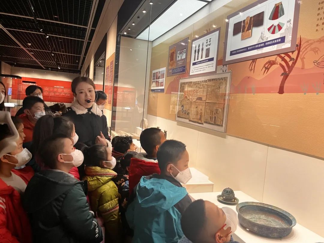 “今天,我们要一起变魔术,通过扎染,让这件白色方巾变幻出许许多多漂亮的图案!”一听到变魔术,小朋友们顿时来了精神。“但在变魔术之前,我要先带大家了解这个‘扎染魔术’的‘前世今生’。”一双双渴求知识的眼睛跟随着社教老师进入了大道攸归五凉文化展的展厅。
