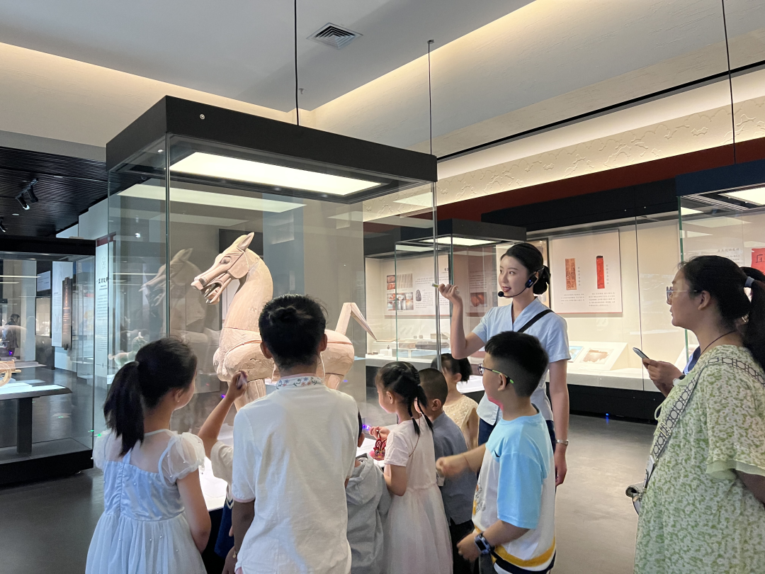 首先,社教老师带领大家参观武威市博物馆基本陈列武威历史文物展,在展厅中寻找带有龙型图案的文物,讲述中华文明五千年的光辉历程。