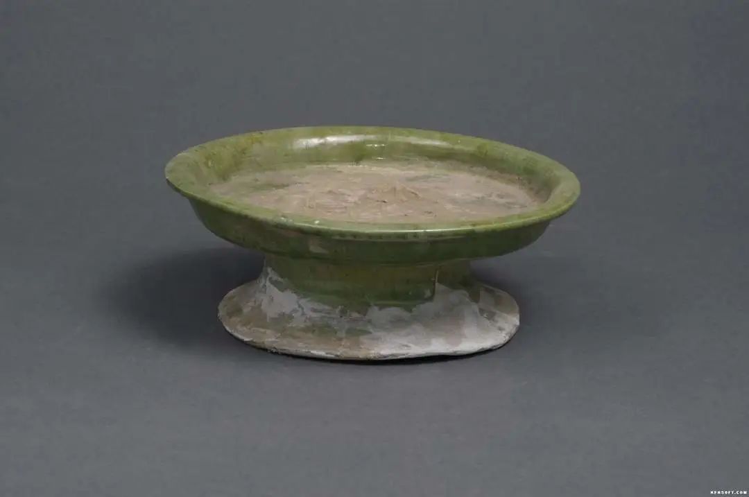 图为馆藏于武威市博物馆的一件唐.开元十四年的三彩陶盘。出土于武威市高坝镇翟公夫妇合葬墓。盘口,翻唇,浅腹平底,高圈足,喇叭状底。通体施绿釉。高7厘米,盘口外径19厘米,底足外径15厘米,此盘器型工整,制作精致,充分展现了唐代高超的制作工艺。
