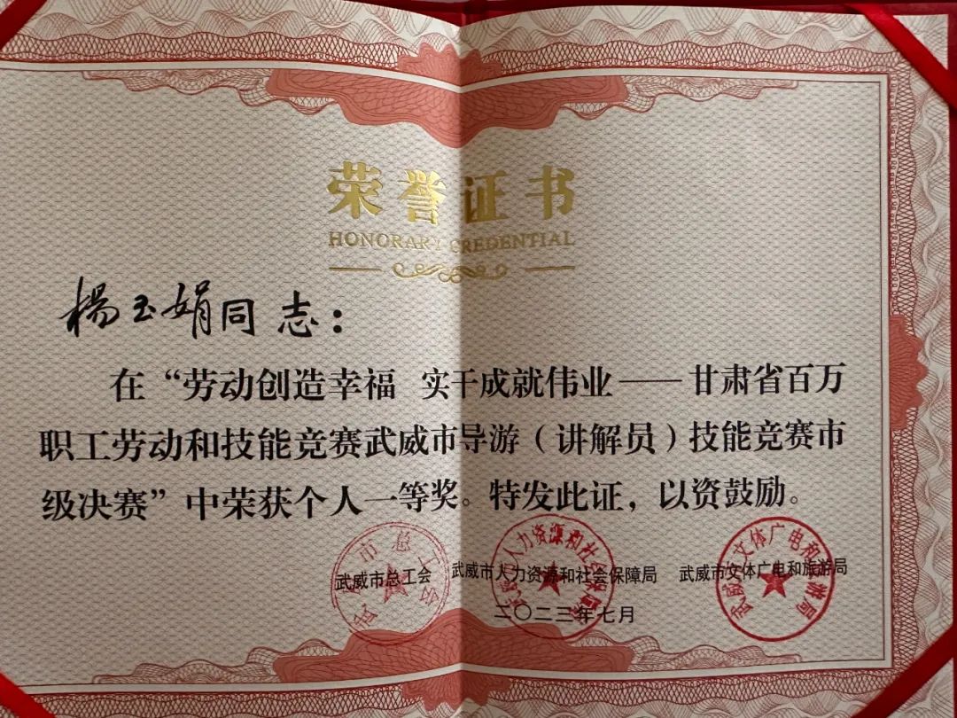 为进一步激励全市导游(讲解员)提升职业道德修养和服务技能水平,7月26日,由市总工会、市人力资源和社会保障局、市文体广电和旅游局决定联合举办的武威市导游(讲解员)技能竞赛落下帷幕。经过激烈角逐,武威市博物馆杨玉娟同志荣获一等奖。