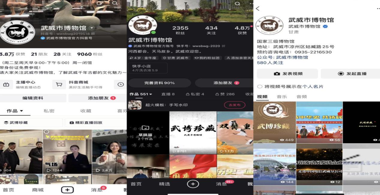 积极顺应公众文化需求,打破线下宣传渠道的单一性,多平台进行线上馆藏展示和科普教育,策划推出《武博珍藏》等系列视频64期,《武威年·最中国》系列海报8期,线上展览32期;围绕学术讲座“国宝省亲之国宝在武威”、社教活动“山川美景你来拼”、研学“云端武博——品读五凉文化”等开展直播活动36次;利用官方网站、微信公众号、抖音等新媒体矩阵平台,发布各类信息797条,多次被中央电视台、中国甘肃网、甘肃新华网等主流媒体报道,扩大了博物馆影响力和宣传范围;制作推出市博物馆宣传画册1本,编写完善《丝路漫游记》等12个精品课程,助力“双减”政策实施;策划开展“武威年 最中国”“丝路探古”等系列社教活动33期,与新城区第一小学、武威第十五中学等16所中小学进行馆校合作,定期开展“博物馆之旅”,进一步丰富“文博社团”活动,全年开展研学活动70次,“四进”活动25次,成功创建为“甘肃省首批博物馆青少年教育省级资源单位”“甘肃省铸牢中华民族共同体意识教育基地”。