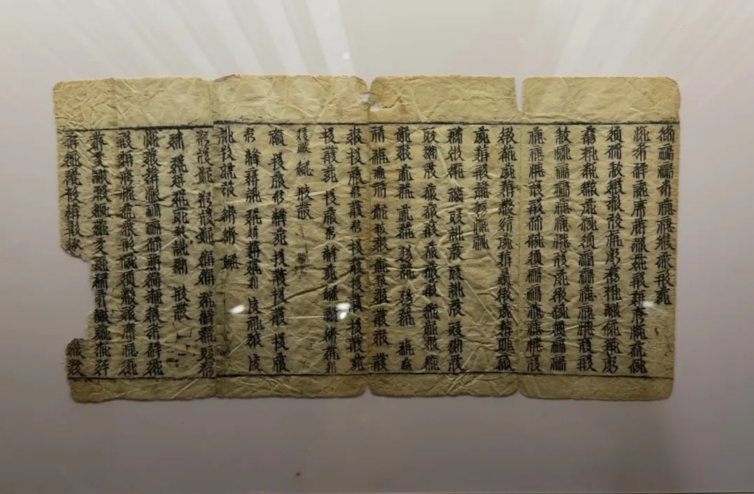 您现在看到的是西夏文印本经“日 一切小皆”。土黄色夹丝绵纸,残存4页,单页6行,满行14字。字迹清晰,内容为佛经,木刻版印制,上下有墨线单栏。背面有粘接痕迹,册页装。