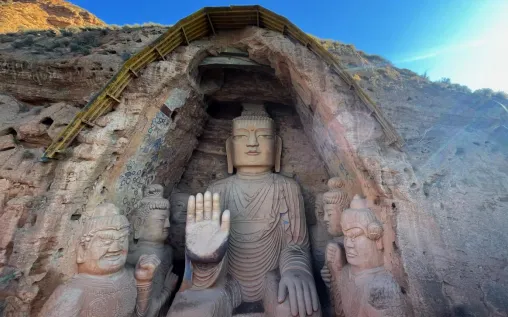天梯山石窟,亦称凉州石窟,坐落于武威市凉州区城南50公里处的张义镇灯山村。它开凿于北凉国王沮渠蒙逊时期,是我国首个由君主主持开凿的石窟,具有极高的历史地位。天梯山石窟与河西走廊其他的石窟共同组成了凉州石窟群,这些石窟在形制上大多摹拟椭圆形平面、穹窿顶的草庐形式,主体体型高大,以三世佛和千佛的造像为主。其历史地位显赫,被史学界尊为“石窟鼻祖”和“石窟源头”。