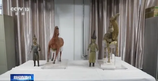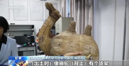 甘肃省文物考古研究所研究馆员 刘兵兵:出土时,像骆驼背上有个货架,货架上面担着的物品的种类是比较多的,代表就是成匹的丝织品。唐朝生产的一些贵重的物品运到西方去,域外输入唐朝的应该有香料、黄金、宝石之类的东西。整体就组成一个商队,我们就能够看到当时丝绸之路上贸易繁荣的一个场景。