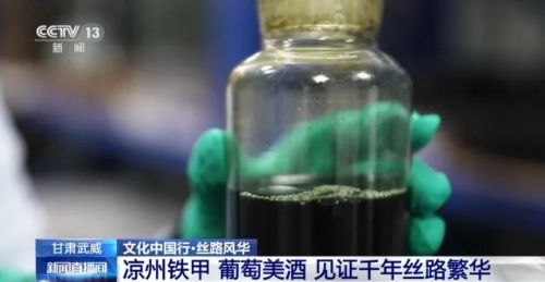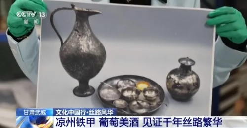 总台央视记者 张芸:“葡萄美酒夜光杯,欲饮琵琶马上催。”诗人王翰在《凉州词》里描述的是唐代边塞的生活场景。唐代丝绸之路上出土的这套酒具目前正在法国吉美博物馆展出,这套酒具出土的时候,当时胡瓶里还残留了200多毫升的液体。经过专家化学鉴定,它是唐代的1300多年前的白葡萄酒,它也是我国目前发现最早的白葡萄酒的实物遗存。
