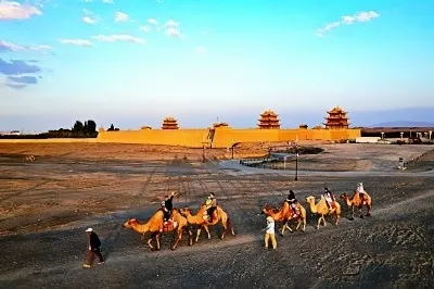 游客在嘉峪关关城旁骑骆驼游览。新华社发