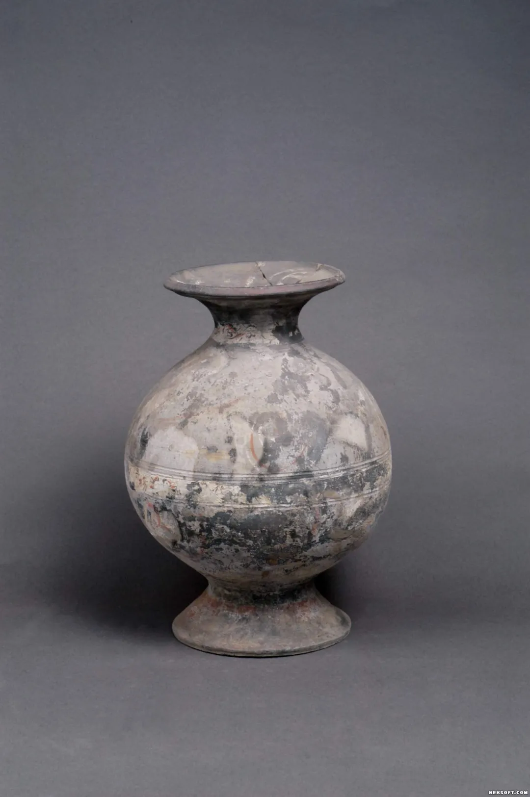 大家好,今天为大家分享的是汉代陶器,灰陶钟。撇口,方唇,束颈,溜肩,圆腹,喇叭形实座,座底直削,底微凹。腹有两组凹弦纹,每组两道。胎体绘一层白衣,白衣上描彩。出土于甘肃武威市磨嘴子,为国家三级文物,现馆藏于武威市博物馆。