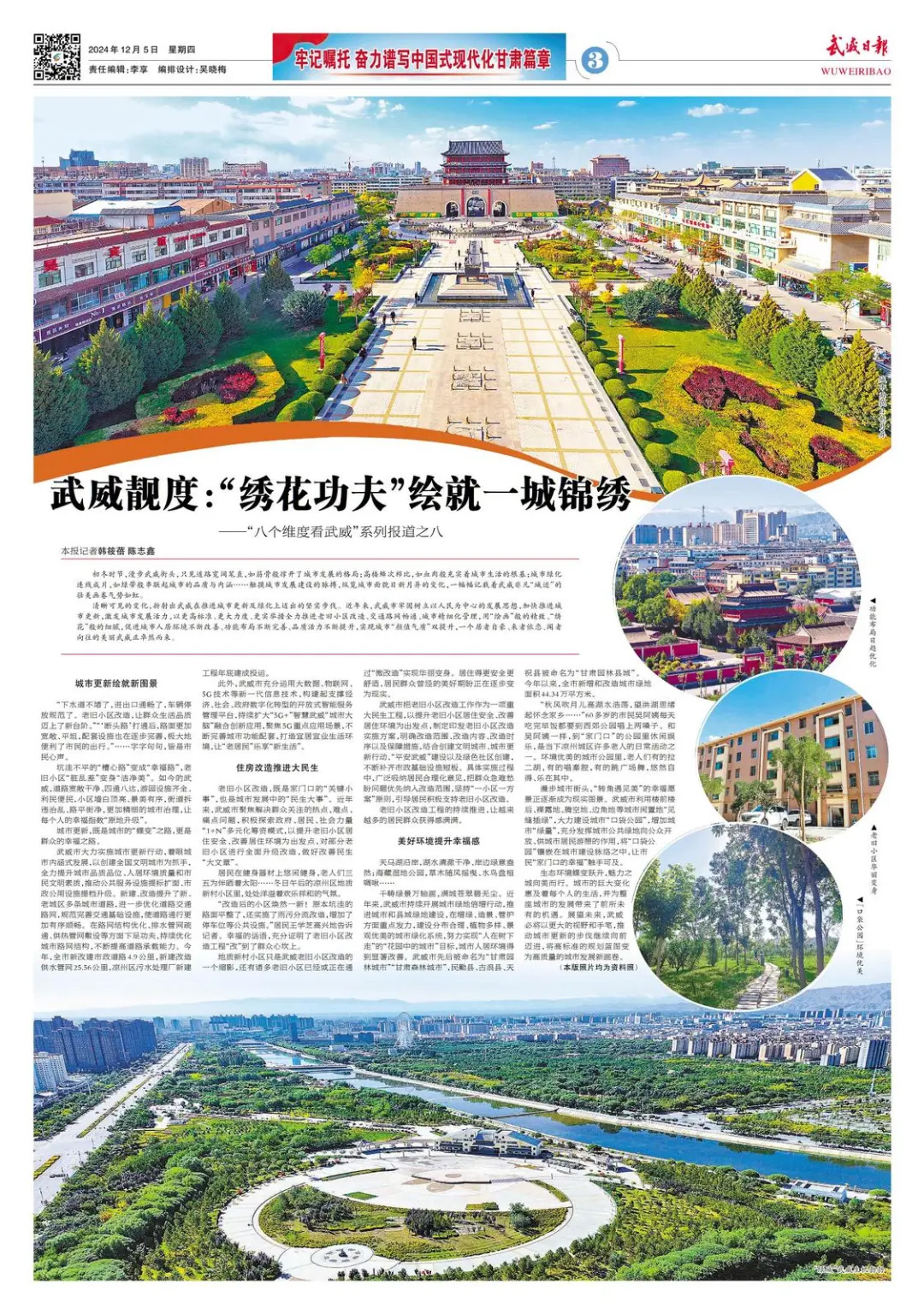 清晰可见的变化,折射出武威在推进城市更新及绿化上迈出的坚实步伐。近年来,武威市牢固树立以人民为中心的发展思想,加快推进城市更新,激发城市发展活力,以更高标准、更大力度、更实举措全力推进老旧小区改造、交通路网畅通、城市精细化管理,用“绘画”般的精致、“绣花”般的细腻,促进城市人居环境不断改善、功能布局不断完善、品质活力不断提升,实现城市“颜值气质”双提升,一个居者自豪、来者依恋、闻者向往的美丽武威正卓然而来。