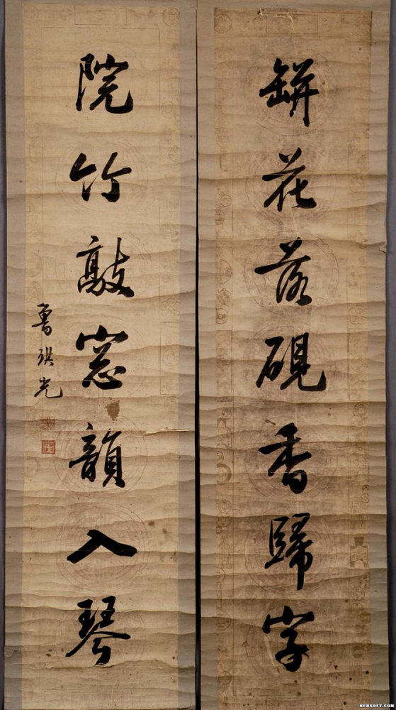 大家好,今天给大家介绍的是民国书法——鲁琪光行书对联。纸本,行书对联。内容为“瓶花落砚香归字,院竹敲窗韵入琴”,落款“鲁琪光”。朱印两方,阴文印“琪光印”,阳文印不清,印文为篆书。现馆藏于武威市博物馆,为国家三级文物。