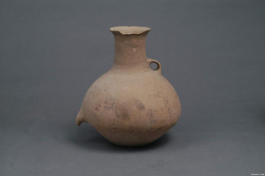 大家好,今天为大家介绍的是一件新时器时代陶器单流单耳彩陶瓶。由甘肃武威市博物馆武威商店于星移交。细泥红陶。黑彩,长颈,溜肩,鼓腹,斜收,平底。颈肩处一侧有一耳,另一侧腹部有一实心假流。彩绘脱落,器型别致。口21.5厘米,高11厘米,底7.5厘米。为国家三级文物。