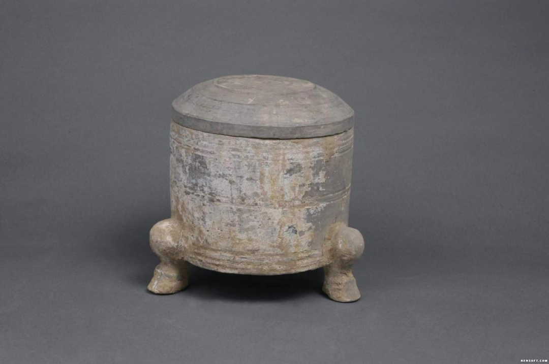 大家好,今天为大家介绍的是一件魏晋时期陶器——灰陶奁。直口,深腹,三兽足,带盖。腹部压印三组复线弦纹。器型独特。出土于甘肃武威二十里大沙滩,为国家三级文物,现馆藏于武威市博物馆。