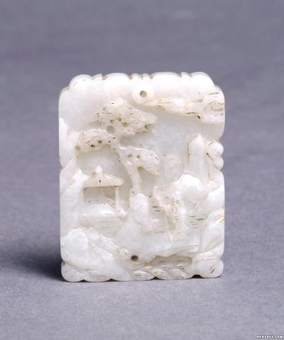 大家好,今天为大家分享的是玉器,人物图玉佩。青白玉质,方形,片状,两面均雕刻纹饰。一面浮雕松、亭,亭旁小桥,桥下流水潺潺,桥上一老者拄杖而行,两边山石林立;另一面上部阴刻纹饰,下部阳刻篆书“倚枝松风下”,五字二行。上下端正中各一穿孔。长5.5厘米,宽4.5厘米,厚0.5厘米。为国家三级文物,现馆藏于武威市博物馆。