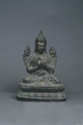 大家好,今天为大家分享的是明代铜器,宗喀巴铜像。铜质,结跏趺坐于束腰仰覆莲座上,双手牵莲花蔓作说法印,双肩饰莲花,左饰宝剑,右饰经夹,说明他是文殊菩萨的化身,双手施转法轮印。高33.5厘米,宽23.5厘米,厚14厘米,基本完整。为国家三级文物,现馆藏于武威市博物馆。