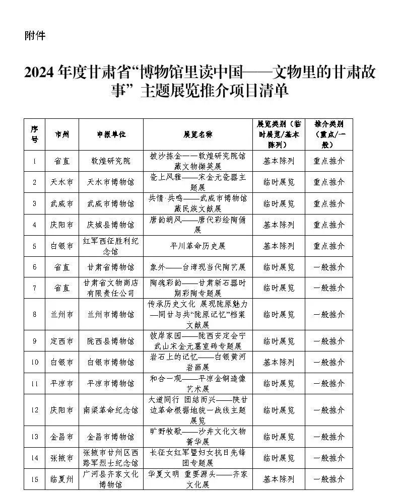 关于2024年度甘肃省“博物馆里读中国——文物里的甘肃故事”主题展览推介项目的公示