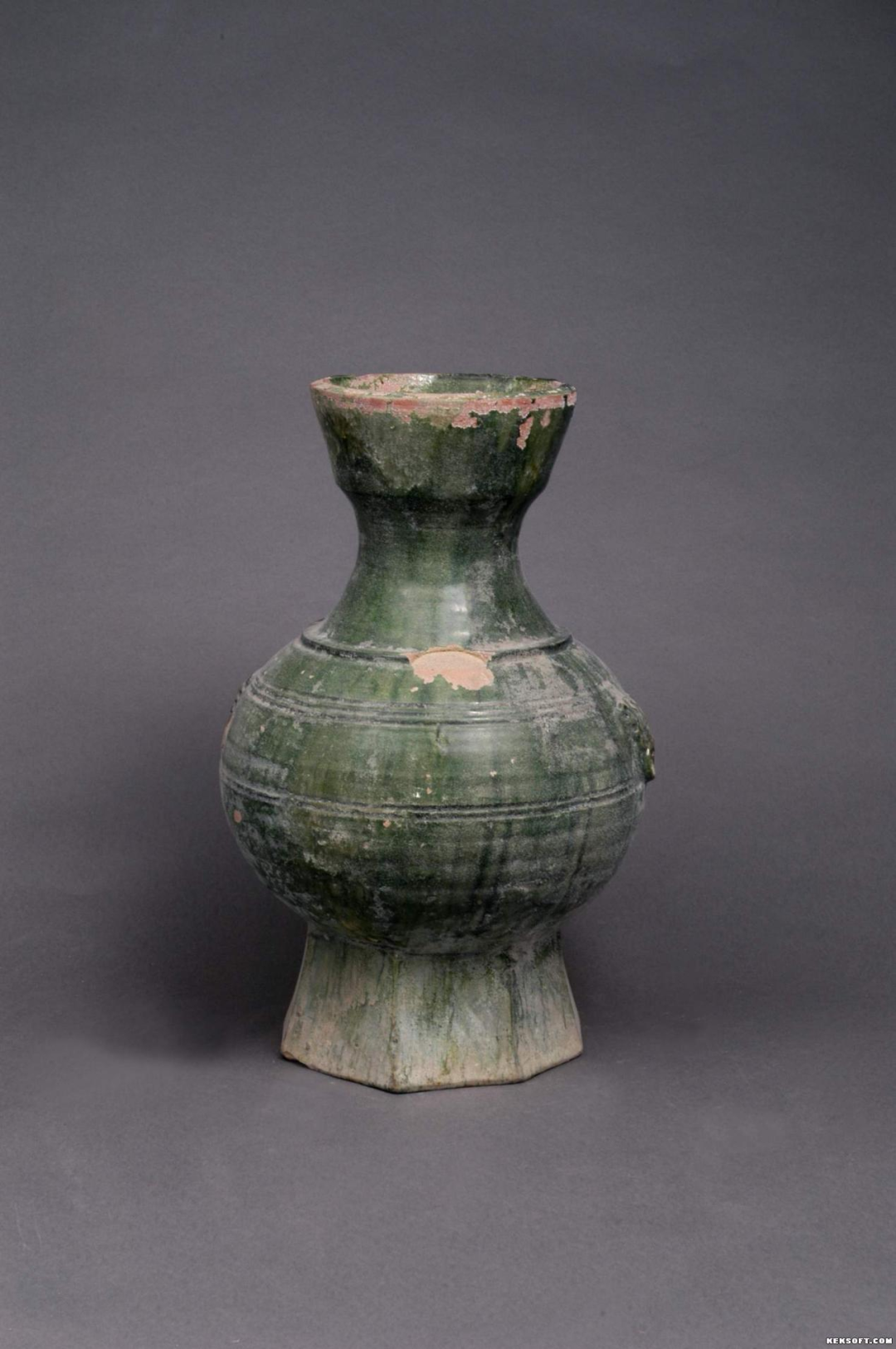 今天为大家分享绿釉陶钟。魏晋时期,陶器。红陶质,绿釉,口微敛,束颈,球形腹,九棱台座。肩部一凸弦纹。腹部五道凹陷弦纹,上腹贴塑对称衔环铺首。为国家三级文物,现藏武威市博物馆。