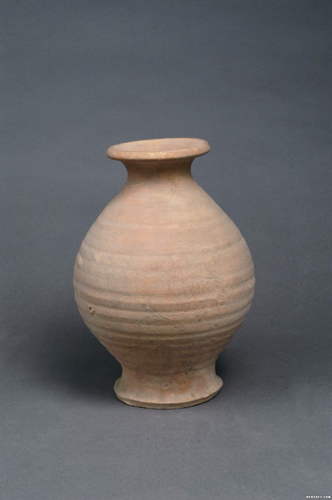 今天为大家介绍的是汉代陶器,红陶钟。出土于甘肃武威新华乡磨嘴子,红陶质,侈口,方唇,束颈,纺锤形腹,台座,平底。器物腹壁留有轮制形成的数道弦纹。为国家三级文物,现馆藏于武威市博物馆。