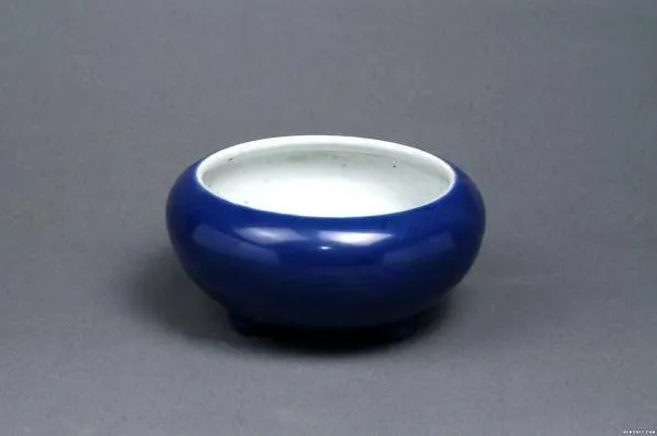 传统蓝釉,以天然钴土矿为着色剂,除含氧化钴外,还含有氧化铁和氧化锰。蓝釉最早见于唐三彩中。但这时还是低温蓝釉,只有绚丽之感,缺乏沉着色调。高温蓝釉的出现是在元代。入明以后,特别是在宣德时,蓝釉器物多而质美,被推为宣德瓷器的上品。至清康熙时,更出现洒蓝釉、天蓝等多种新品种。蓝釉以氧化钴为呈色剂,最早见于唐三彩,宋代钧窑以天蓝釉为主色调,元代景德镇烧成了高温蓝釉瓷、明清时又烧成了洒蓝、天蓝孔雀蓝等蓝色釉瓷,具有很高的艺术价值和收藏价值。主要作为文房用品中的水盂,用于盛水以供研墨、洗笔等;也有部分作为生活中的盛器或陈设器使用。其独特的蓝釉工艺、精美的造型和丰富的纹饰,反映了清代制瓷业的高超水平。