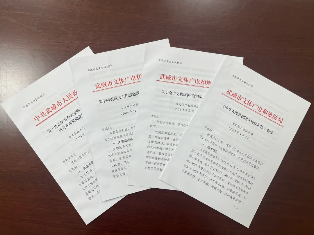 通报指出“武威市政府高度重视文物保护工作,学习《文物保护法》,听取全市文物、长城保护工作汇报,并安排部署重点工作任务。”2024年,全省文物工作会议高规格召开,市委主要领导在分会场参加视频会议,市政府常务会议、市委常委会议相继传达学习会议精神,并研究部署我市贯彻落实意见。市政府常务会议多次安排学习习近平总书记关于文物工作的重要论述和指示批示精神,先后3次听取全市文物工作汇报,市委、市政府分管领导多次实地调研文物博物馆单位,文物保护组织领导不断加强。