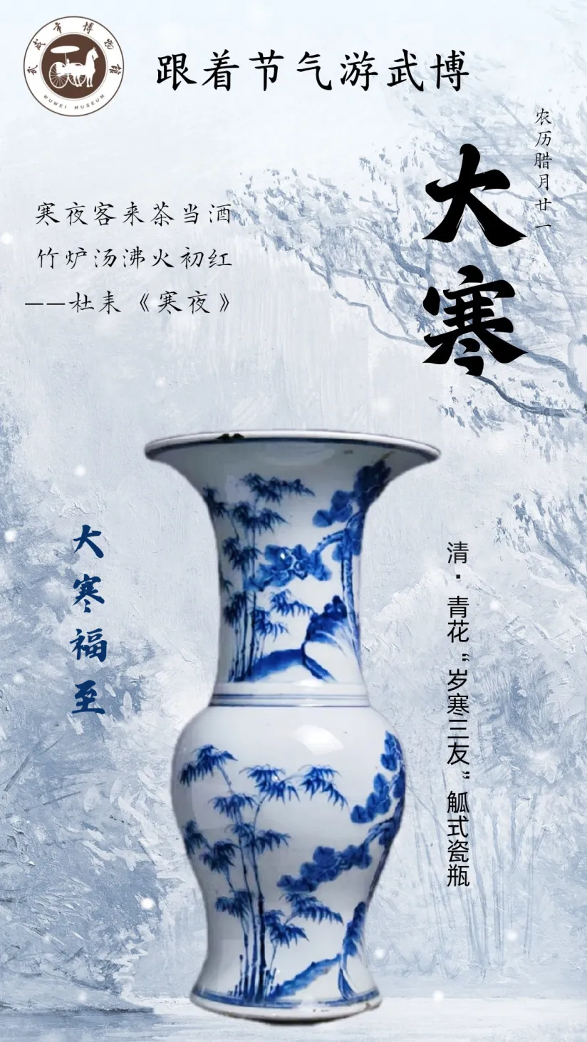 武威市博物馆内陈列着一件清代青花“岁寒三友”觚式瓷瓶,为国家二级文物,造型古朴大方、端庄秀美。瓶的胎质细腻洁白,釉面晶莹光润。瓶身正面绘有寓意“挺拔、高洁、清骨”之气的松、竹、梅,是典型的官窑代表作品之一。 大寒时节,天地封藏。但在博物馆中,文化传承的火焰从未熄灭。每一件文物都是薪火,延续着中华民族的精神脉络 。