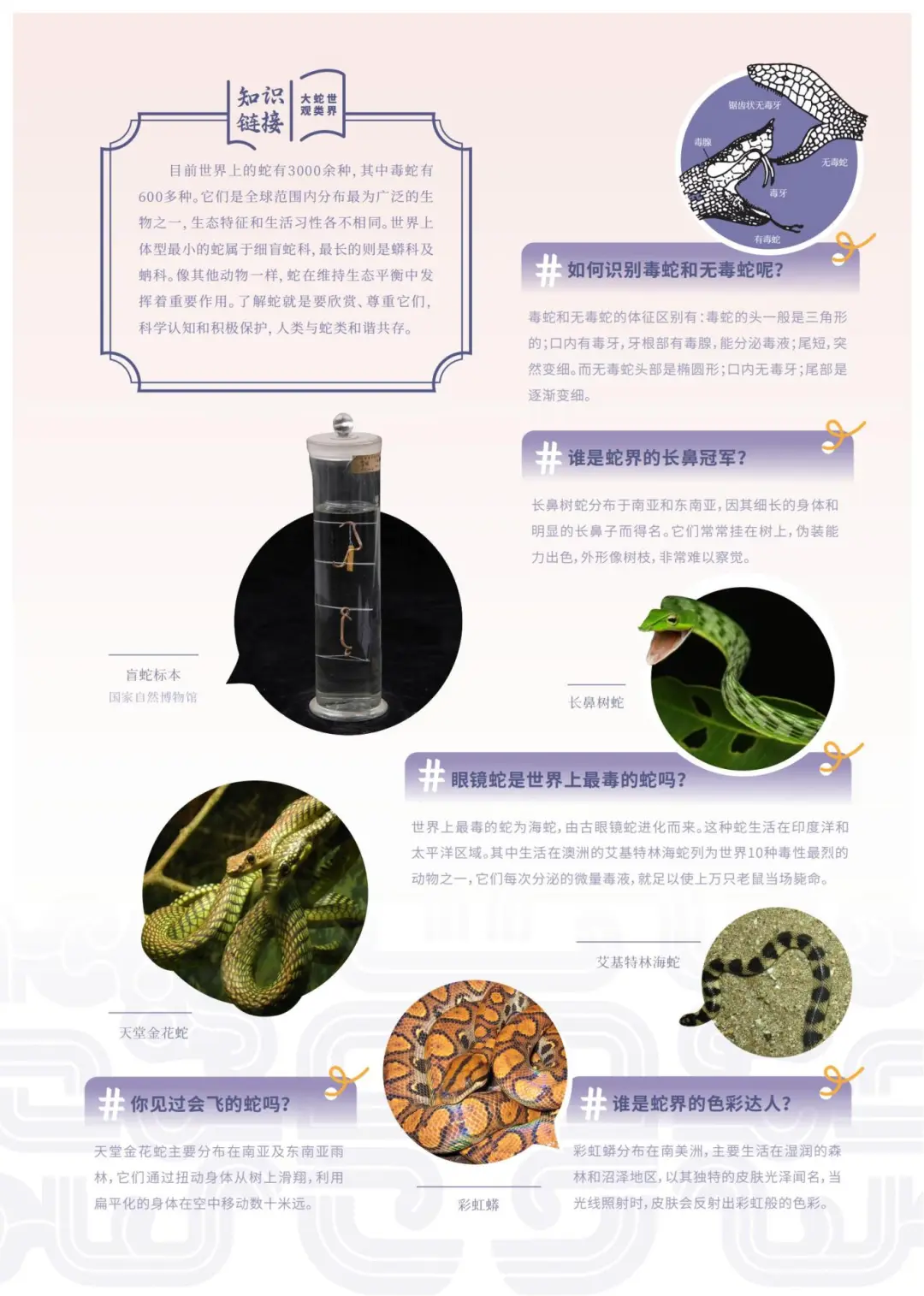 蛇大约出现于1.5亿年以前,行迹遍布全球,共有3000余种,主要分为真蛇下目与盲蛇下目两大类。它们身形倾长,无四肢,依靠波浪式蠕动移动,具有发达的嗅觉系统和热感知能力,能有效定位猎物,并靠定期蜕皮以适应生长。
