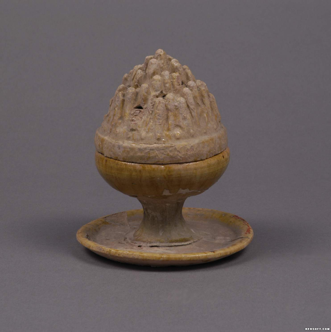 大家好,今天向大家分享的是汉代陶器黄釉博山炉,红陶质,分盖、身、托盘三部分,炉盖高而尖呈山峦形,有镂孔,炉身呈半球形高足杯状,托盘,侈口,浅弧腹,平底。通体施黄釉,底无釉。结构简单,器型规整,为汉代流行的随葬明器之一。为国家三级文物,现馆藏于武威市博物馆。