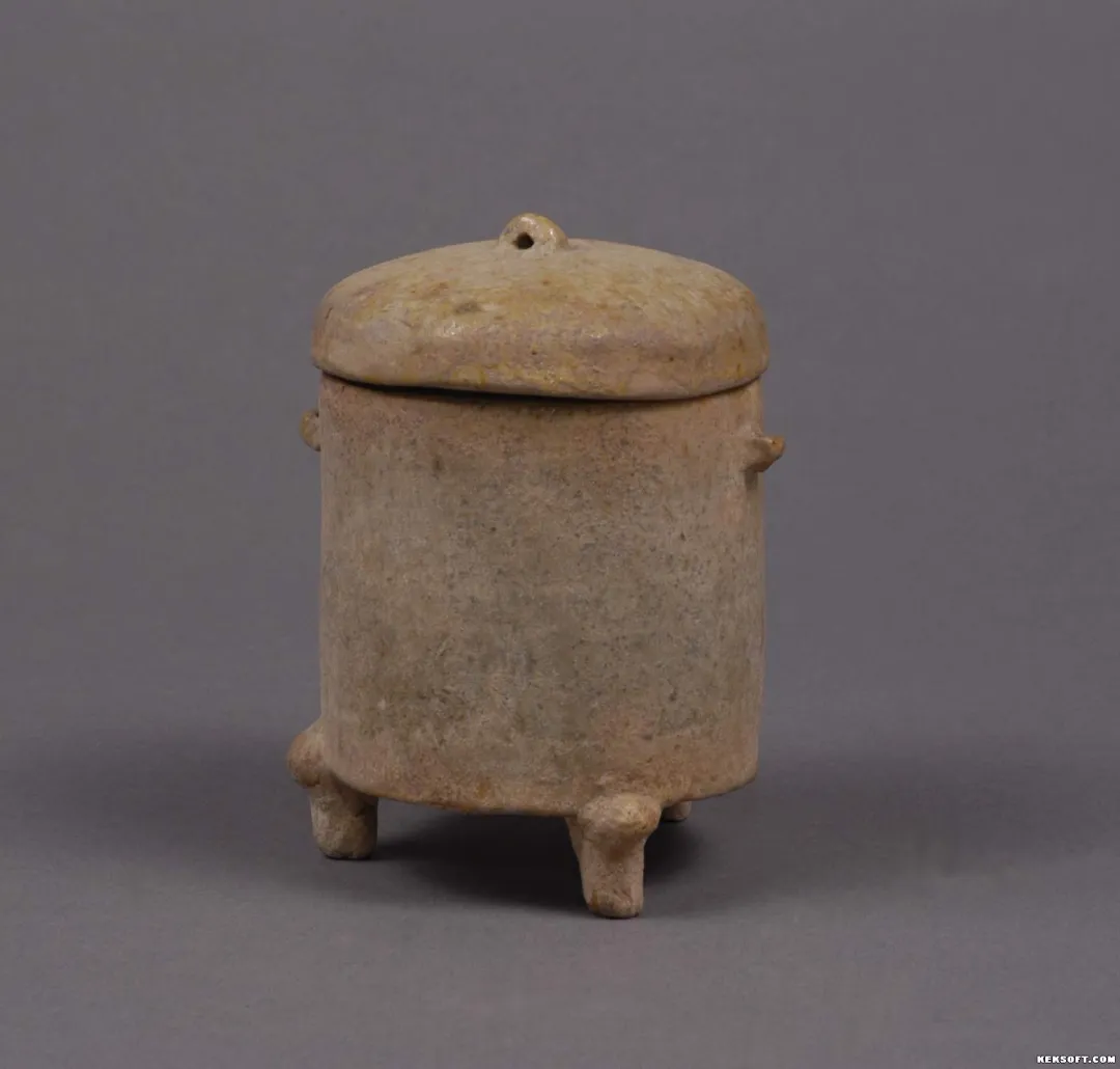 大家好,今天向大家分享的是汉代陶器三足黄釉陶炉,红陶质,由盖、身两部分构成,盘形盖,中间一桥形钮。身圆口,圆唇,平肩,筒式腹,上小下大,平底。三兽形足。腹部一对小耳。通体施黄釉,釉面有许多斑点,器型较规整。为国家三级文物,现馆藏于武威市博物馆。
