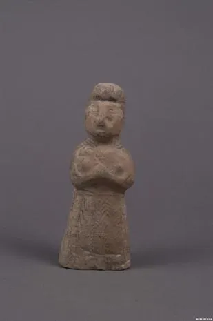 大家好,今天向大家分享的是汉代陶器垂柳纹长袍女陶立俑,灰陶质,立姿,面丰,双手置于胸前,黑发梳螺形髻,五官刻划捏塑出大眼、隆鼻。着圆领长袍,袍上压印垂柳纹,纹路清晰。通体施白陶衣,造型质朴、简洁。为国家三级文物,现馆藏于武威市博物馆。