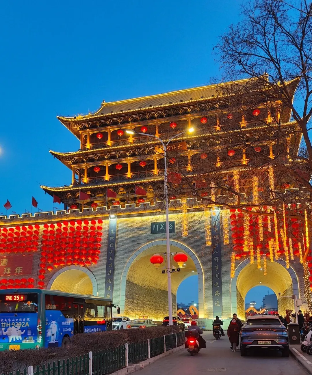 暮色四合时,我们循着渐暗的街景走来,远远便望见南城门楼的轮廓在暮色中愈发清晰。当年为纪念凉州总管卫王杨爽平定突厥、镇守河西的功绩,“昭武门”在此奠基;而后历经朝修缮,它在岁月更迭中不断被打磨、被滋养,如一位沉默的守护者,见证着武威城的过往与今朝。