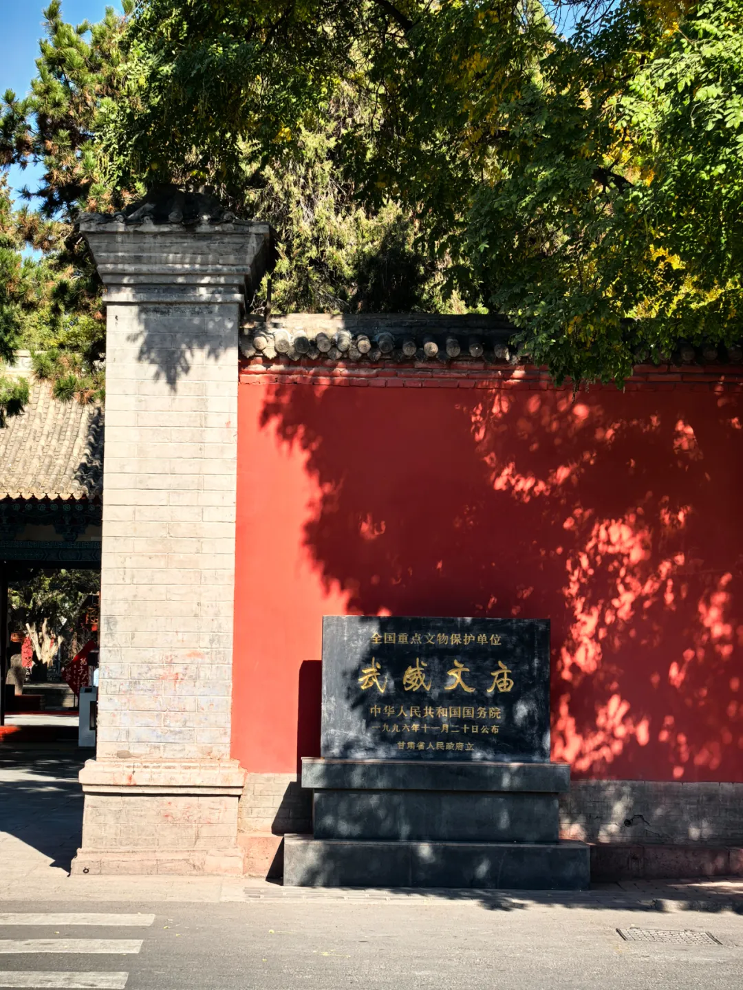午后的阳光洒在文庙的朱红门上,静谧安详。我们拜谒素有“陇右学宫之冠”美誉的武威文庙。武威文庙是仅次于山东曲阜文庙、北京文庙的第三大文庙。戟门、棂星门、大成殿依次排列,飞檐翘角间满是书香气息。大成殿内,孔子及七十二贤的牌位静静矗立,殿前的古柏已有数百年树龄,枝叶婆娑,似在诉说着凉州崇文重教的传统。明清时期,这里是河西学子求学的圣地,无数读书人在此寒窗苦读,从凉州走向更广阔的天地。这座始建于明正统年间的建筑群,如今仍完好保存着从清康熙年间延续至民国225年的52块历代匾额,其纪年、题跋者身份可与文献印证,还原当时凉州政治、教育、文化生态,同时作为丝路重镇文化交融的缩影,佐证凉州在中原文化西传中的重要节点地位。匾额以“尊孔崇儒”“文运昌隆”为核心主题,将儒家思想与民间文化信仰结合,实现儒学在地化传播,并且通过历代题跋形成“文化接力”,传递重视教育的价值观,成为凉州传统教育的精神符号。
