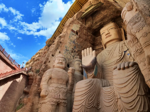 钻过一道幽暗的涵洞,沿着水库畔的栈道前行,右侧是赭红色崖壁洞窟如星辰般嵌在其中。拾阶而下,一尊依山而凿的释迦牟尼坐像赫然出现在眼前。来到佛像脚下仰头望去,坐像高逾二十多米,虽历经千年风雨侵蚀,衣袂的褶皱仍透着庄严。佛像双目微阖,似在凝视河西大地的沧桑变迁。北凉时期,高僧昙曜曾在此开窟造像,将佛教艺术与河西的山石融为一体;后来北魏迁都平城,工匠们带着天梯山的技艺北上,才有了云冈石窟的恢弘,东传洛阳,又滋养了龙门石窟的华美。再后来又西渐至河西走廊,有了莫高窟的驰名中外、马蹄寺的传承文脉、文殊寺的恢弘胜景。站在佛像前,仿佛能看见一条无形的艺术长廊,从凉州出发,跨越山川,串联起中国佛教石窟的璀璨星河。