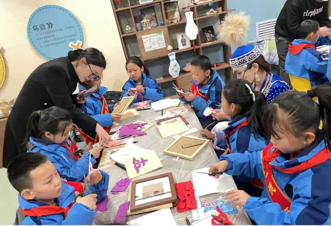 观展结束后,学生们来到社教活动中心,开启刺绣文化的实践之旅。现场,老师用通俗生动的语言,系统讲解了哈萨克族刺绣的悠久历史、文化背景及经典图案寓意——那些源自草原图腾、生活场景的纹样,每一个都藏着民族的审美与智慧。最令人期待的手工DIY环节中,学生们迫不及待地拿起提前准备好的刺绣纹样贴片、底布与装饰材料,在讲解员指导下挑选心仪图案、精心剪裁,再小心翼翼地粘贴定位。指尖翻飞间,原本朴素的底布上渐渐绽放出灵动的民族纹样,孩子们专注投入,不时相互分享剪裁技巧与心得,脸上洋溢着创作的喜悦。