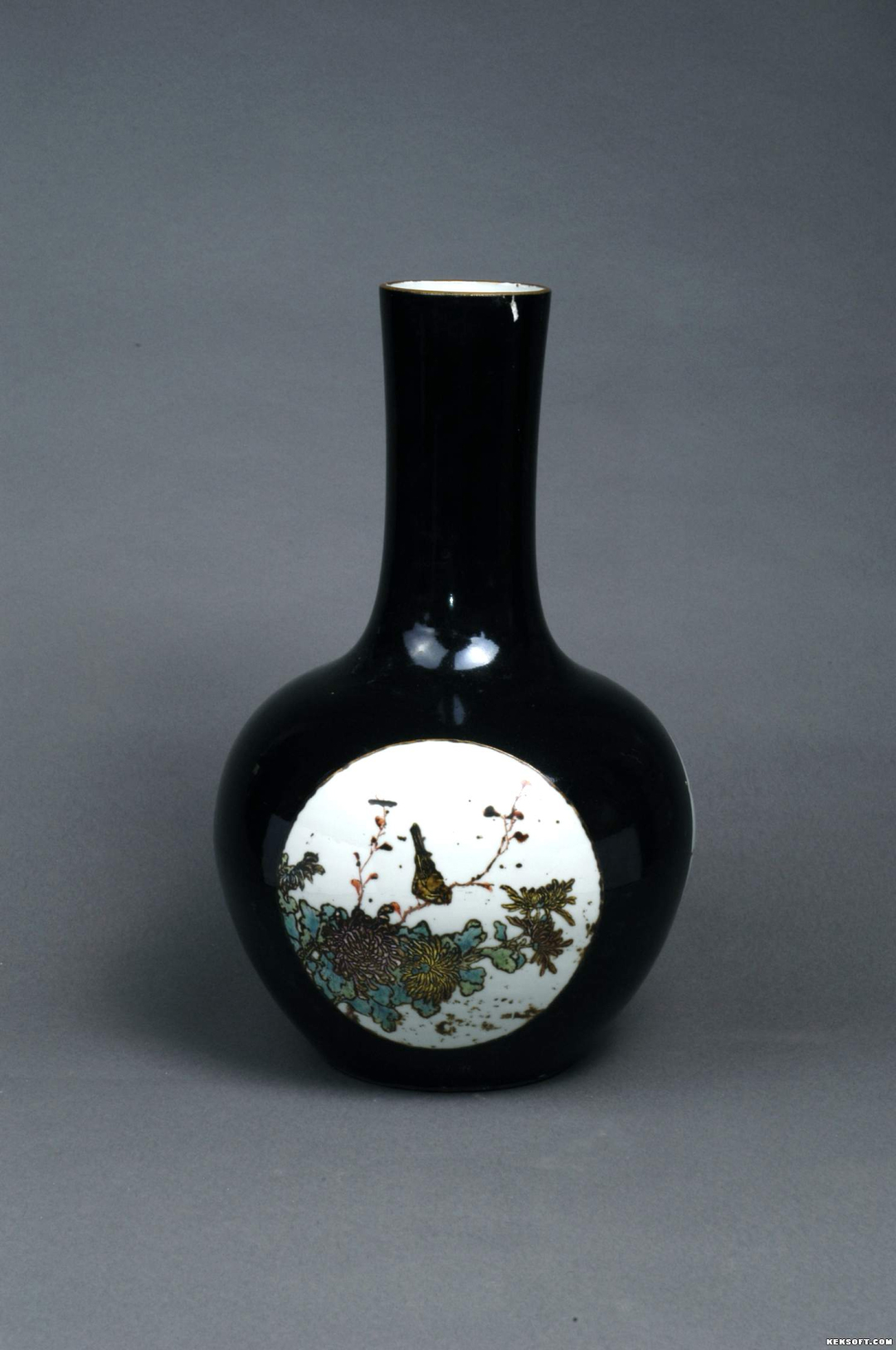 大家好,今天向大家分享的是清代瓷器——蓝釉开光天球瓶。直口,长直颈,球形腹渐收成底,圈足无釉。白胎蓝釉。口沿处镶嵌三个金边,腹中有三个圆形开光,均以白色釉为底,金线为边。开光内绘花鸟图。花卉均为菊,或红,或黄,衬于绿叶间;有鸟,或停枝头,或盘旋上空。足底红色落款共四字“居仁堂制”。甘肃省武威市城关镇出土,为国家三级文物,现馆藏于武威市博物馆。