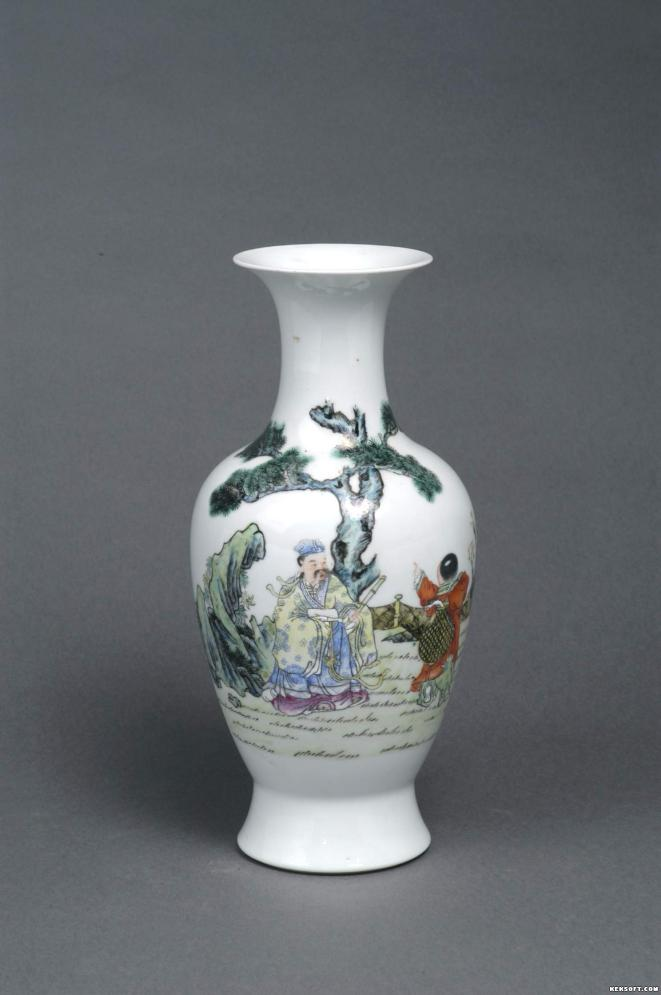 大家好,今天向大家分享的是清代瓷器——五彩瓷瓶,喇叭形口,长细颈,平肩,直圆腹下收,胫部外撇,圈足,足端一圈凸弦纹,无釉。白胎白釉,胎细薄,釉细腻。自颈至腹底,绘五彩人物图。松下老者持竹杖问讯,一童子背竹笼指答,笼中装蛇。足底朱书“慎德堂制”,楷书。为国家三级文物,现馆藏于武威市博物馆。